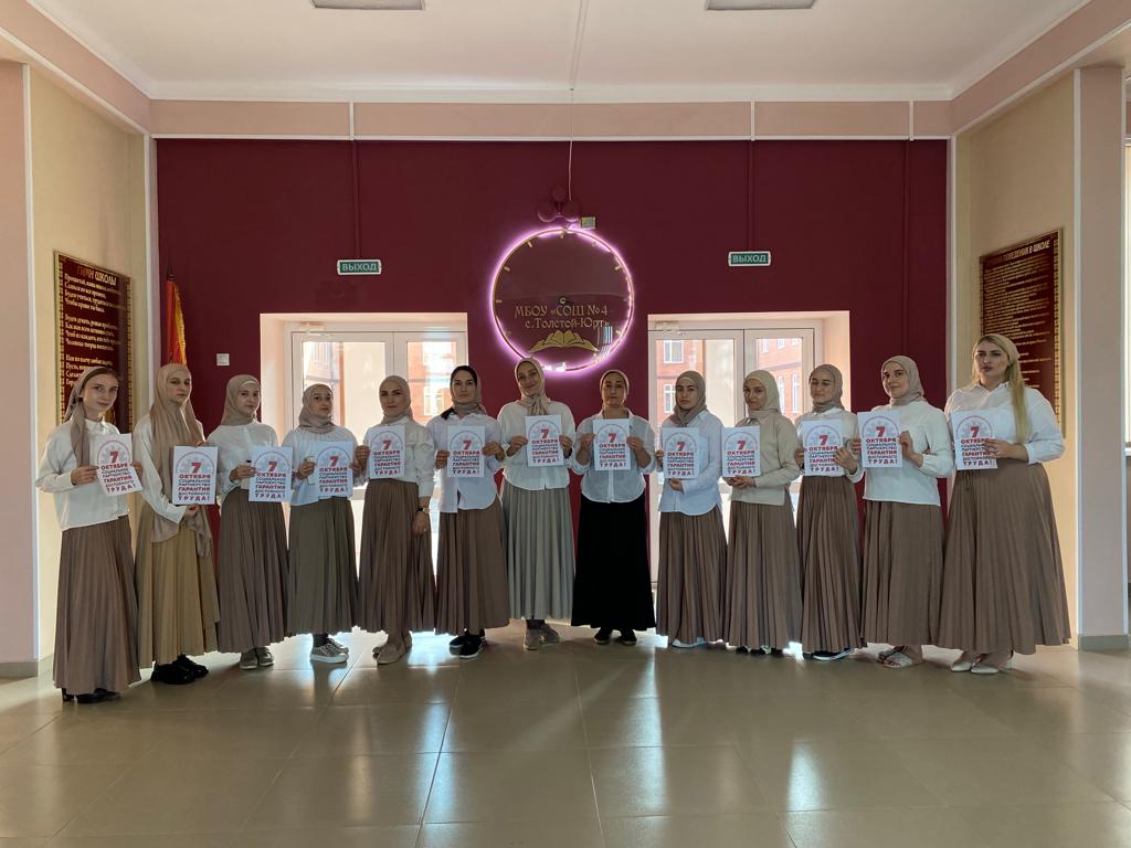 в МБОУ "СОШ 4 с. Толстой-Юрт " проведён флешмоб в рамках Всероссийской акции Профсоюзов всемирного дня действий " За Достойный труд"